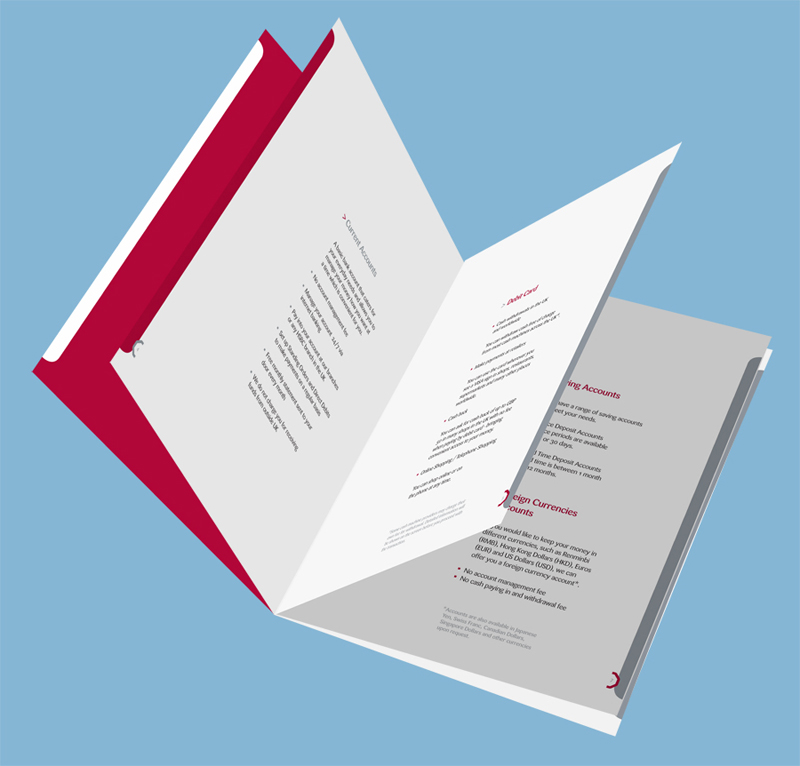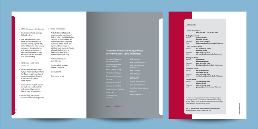 —Bank of China is the second largest bank in the world. The design brief was to create a series of brochures for the UK market. The client wanted to incorporate both Chinese and British elements within the design yet making the brochures appealing to the UK target audience.