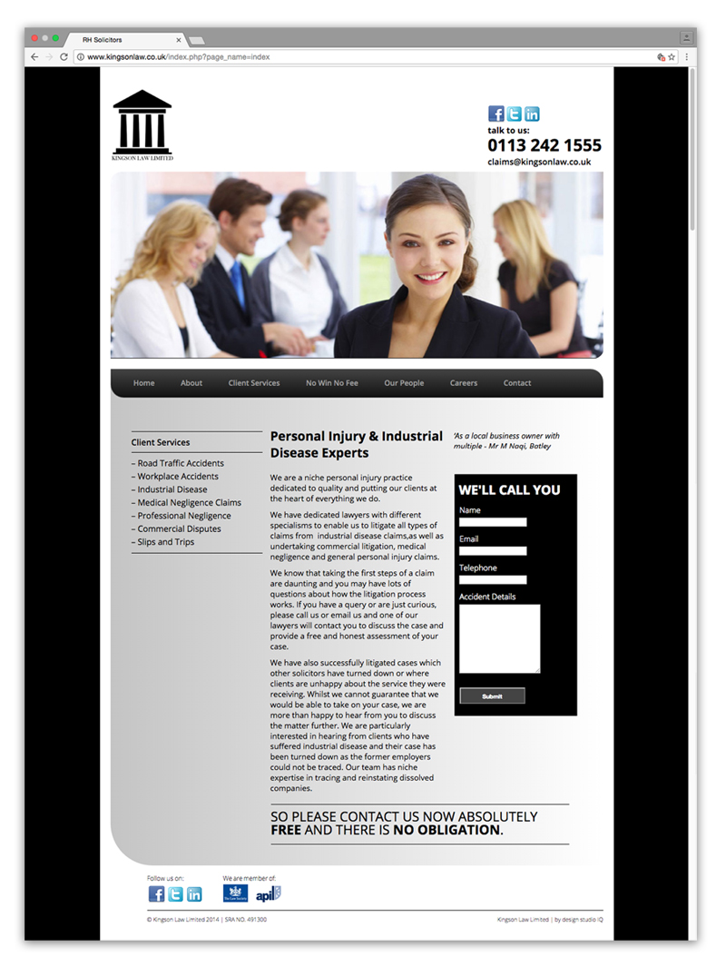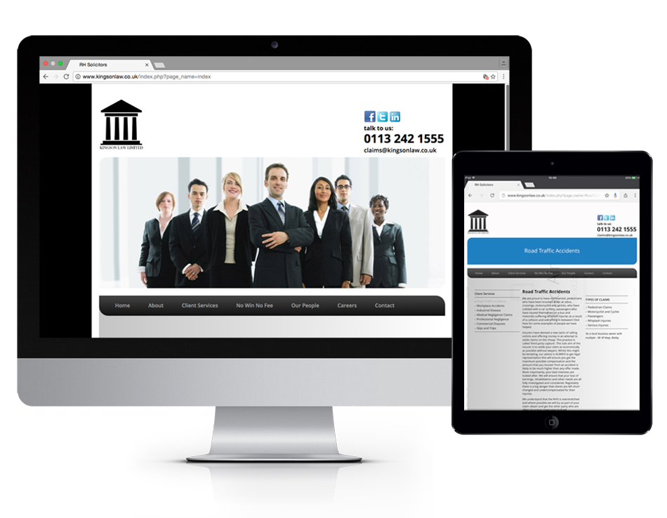 —Kingson Law, also known as Rh Solicitors, is a No Win No Fee solicitors. They specialise in road traffic accidents. Other services that they provide are for medical negligence claims, work place accidents, industrial diseases and slip, trip and fall.